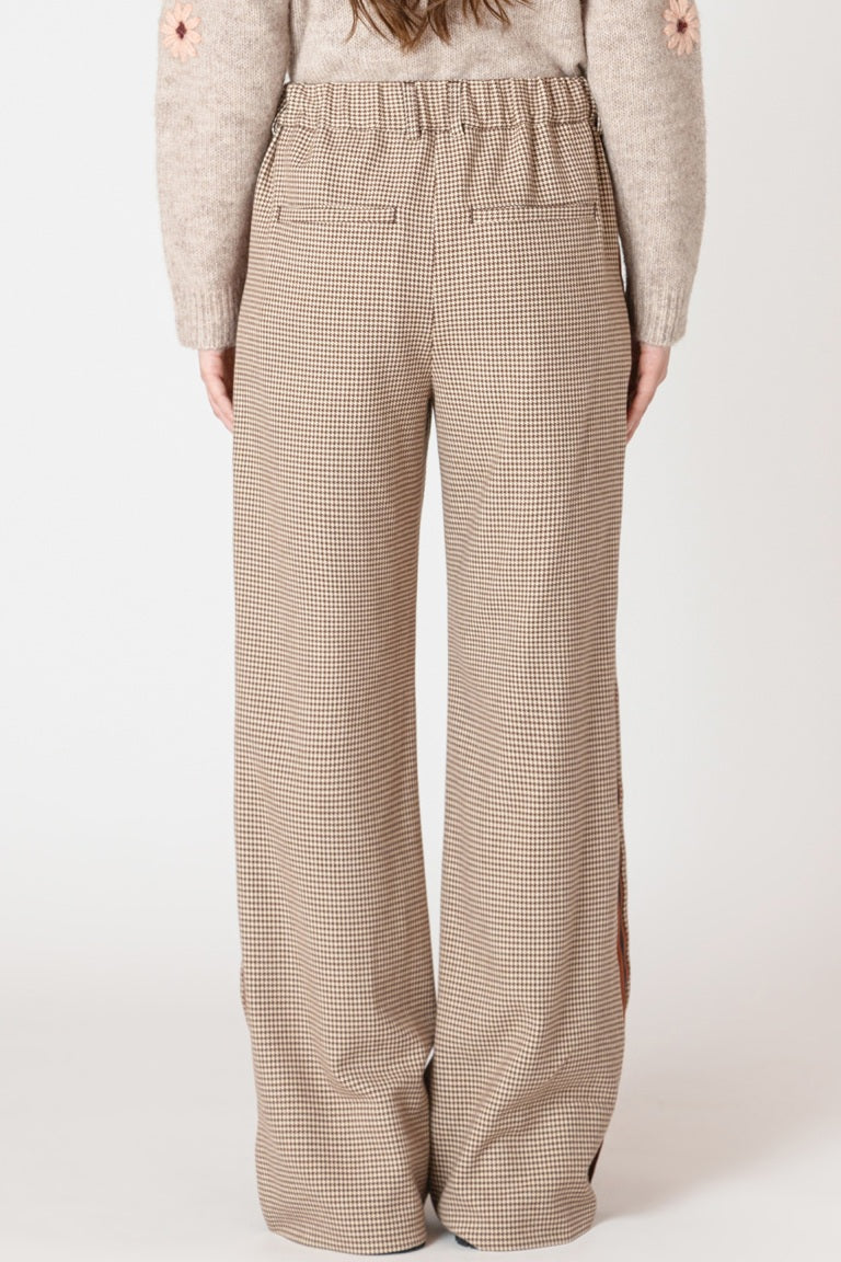 Description: a wide leg neutral houndstooth patterned pant featuring a two-tone side stripe in a stretchy knit fabric, a zip and button closure, and side pockets