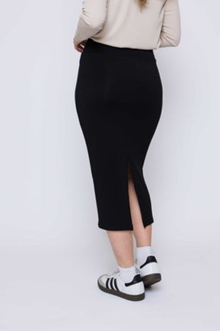 Description: a high-waisted midi length skirt in orb's stretchy luxe fleece with a wide waistband, back slit, and 30" length from top of waistband to hem -- complete the set with the jenna crewneck