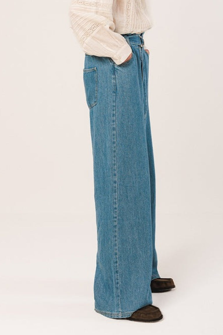 Description: relaxed, soft lyocell high-rise pant with an elasticated waistband and an adjustable belt creating slight ruffles at the waistline and features front denim pockets