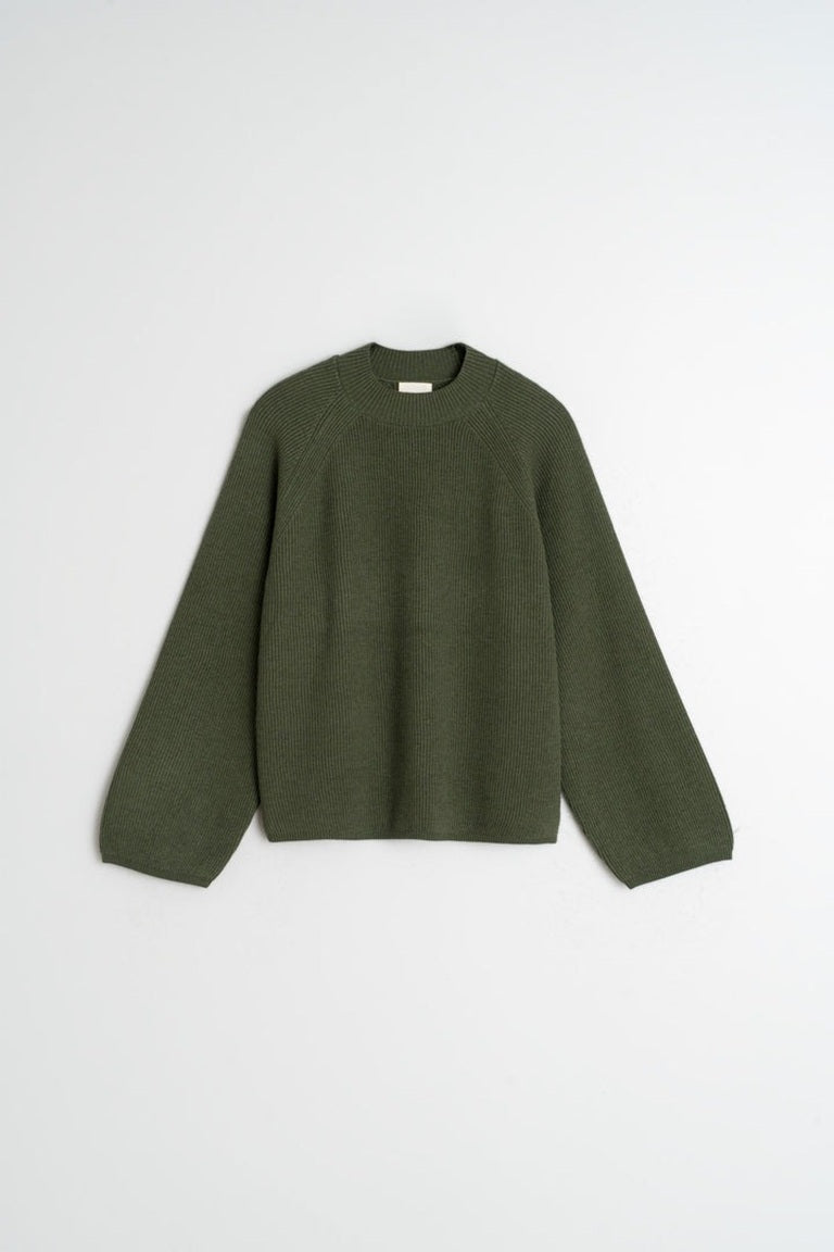 Description: boxy ribbed sweater with a perkins collar, side slit, and slightly wide raglan style sleeves