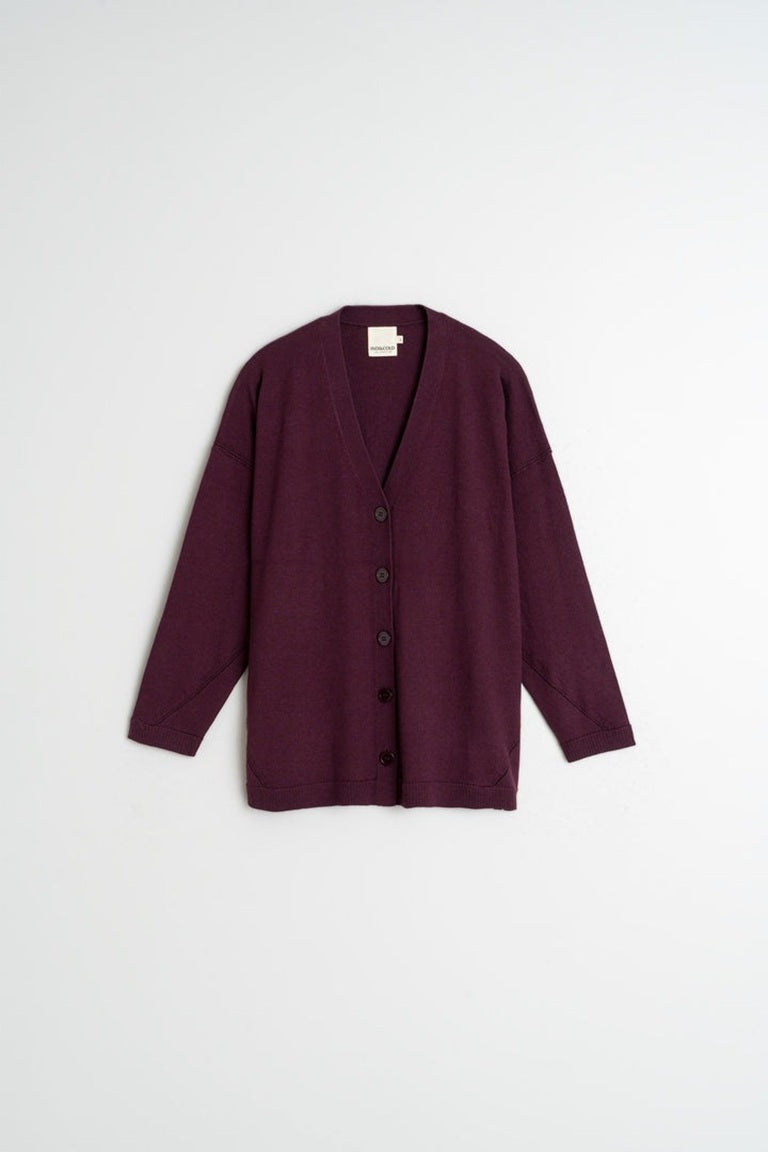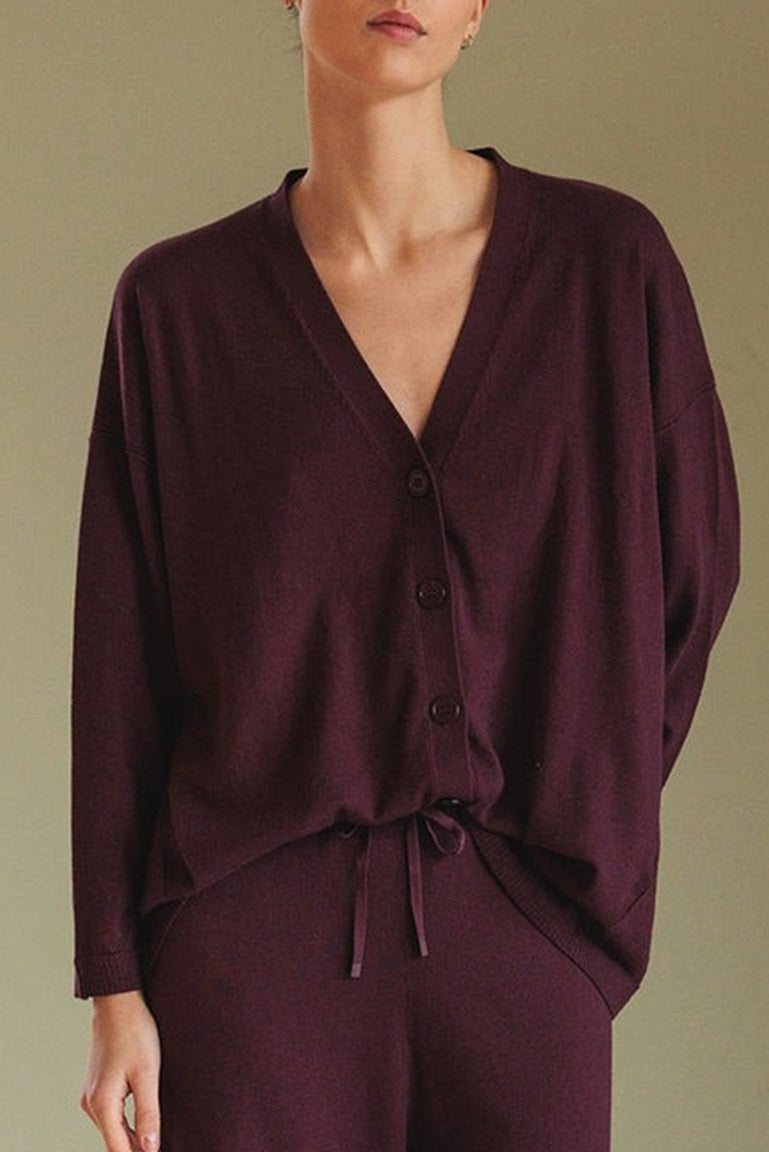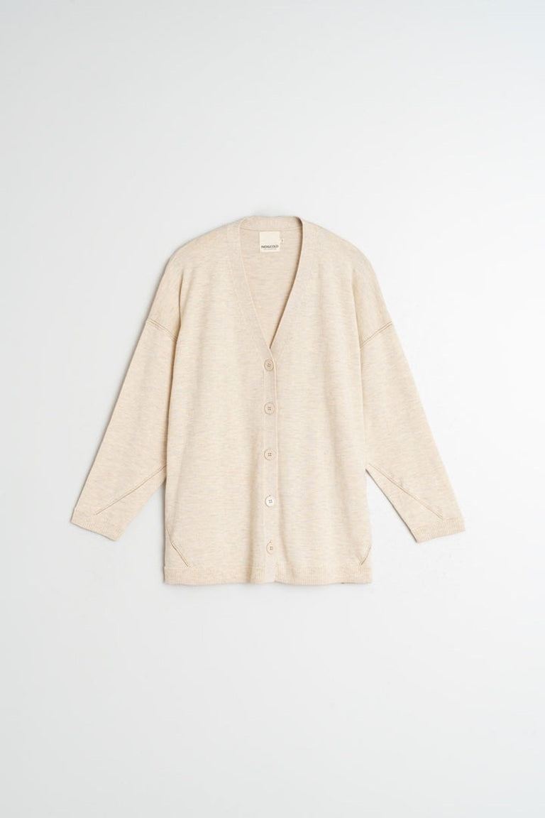 Description: super soft wool and seawool yarn knit features a v-neck drop shoulder and central button closure