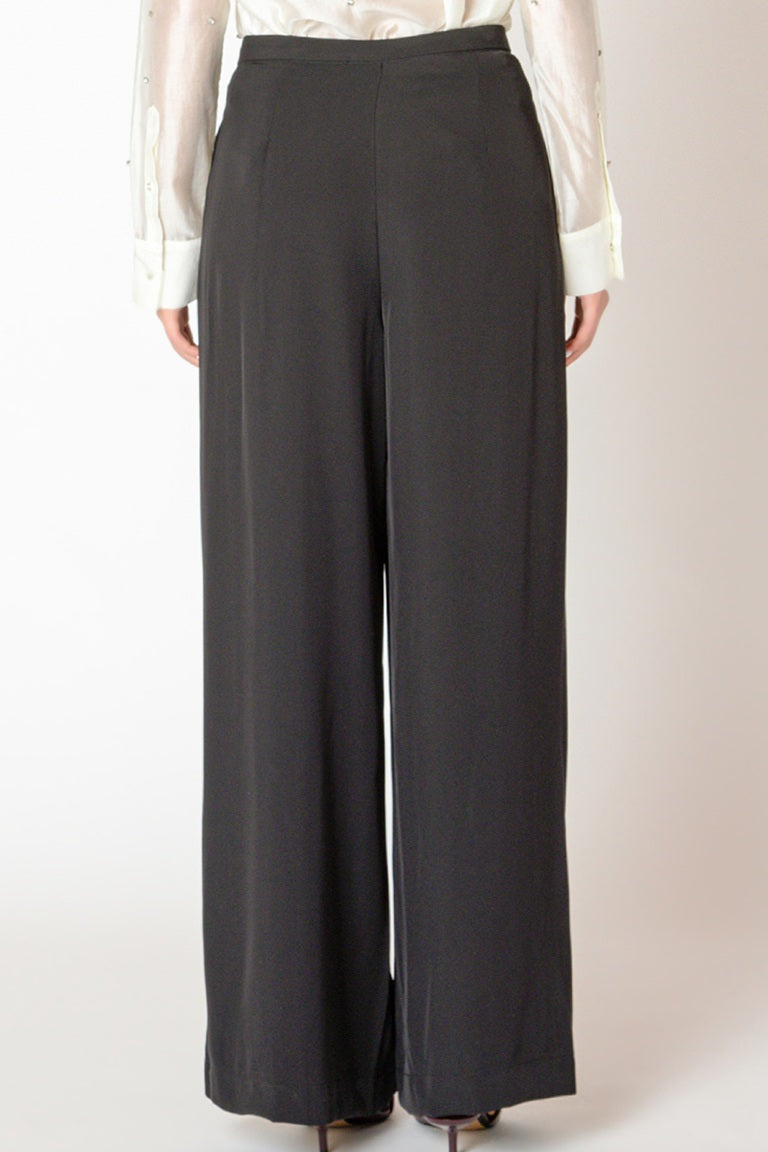 Description: a lightweight wide leg trouser featuring a pleats below the waistline and a single button closure detail
