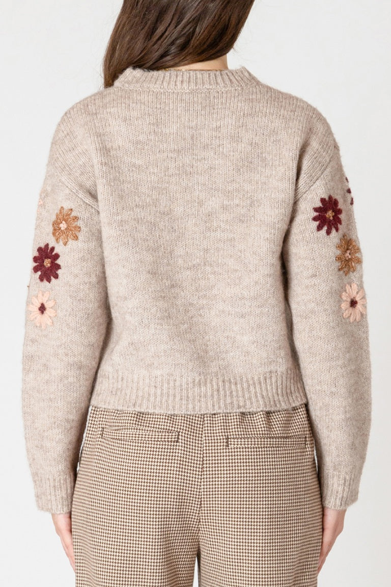 Description: a knitted sweater w/ super cute floral appliques, a round neckline, and long sleeves
