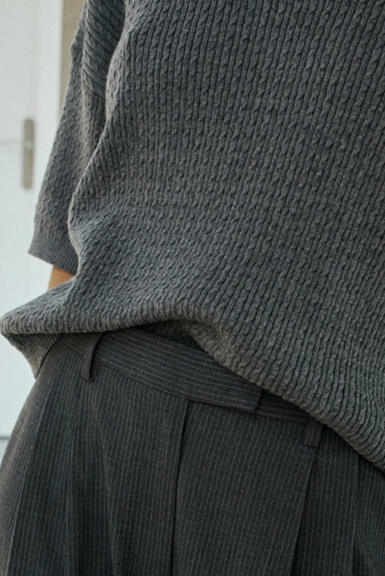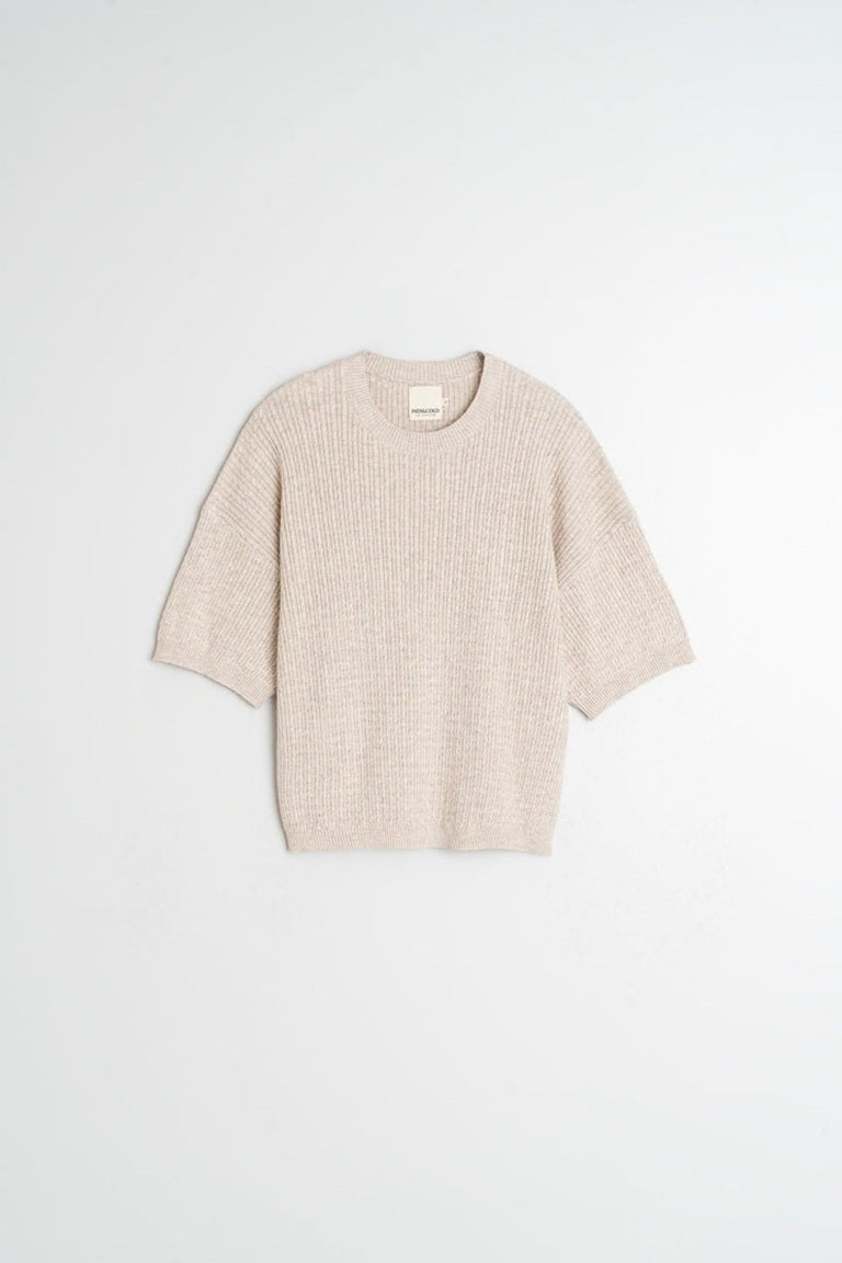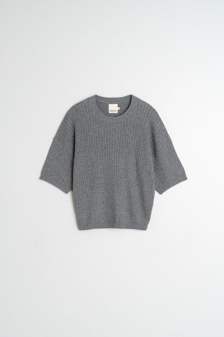 Description: a sustainable braided wool knit sweater with dropped shoulders, crewneck, and short sleeves